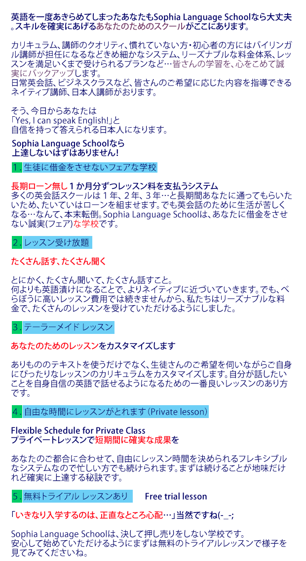英語を一度あきらめてしまったあなたもSophia Schoolなら大丈夫。スキルを確実にあげるあなたのためのスクールがここにあります。
